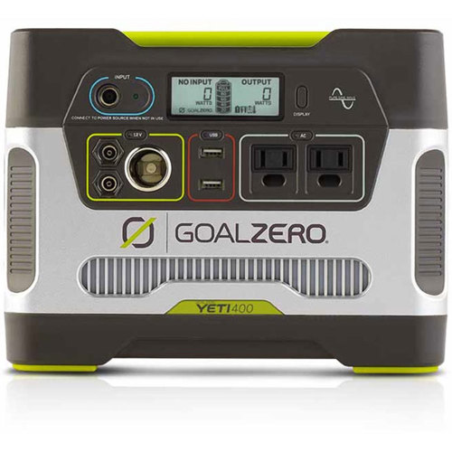 Complete charge times are: Wall charger (72W): 5 hours, car charger (30W): 13 hours, Nomad 20: 30-60 hours, Nomad 50 (see SKU: GLZN50SP): 12-24 hours, Boulder 50: 12-24 hours, Boulder 100: 6-12 hours, Boulder 100 Briefcase: 6-12 hours and Nomad 100 (see SKU: GLZN100SP): 6-12 hours. Boulder 200 Solar Panel: 3-6 Hours (NOTE: Connecting the Yeti 400 to the Boulder 200 Briefcase requires a High-Power Port to 8mm Connector cable). The Goal Zero Yeti 400 110V Portable Power Station has the following ports: USB port (output): 5V, up to 2.1A (10W max) regulated, 6mm port (output, 6mm, green, hexagon): 12V, up to 10A (120W max), 12V car port (output): 12V, up to 10A (120W max), AC inverter (output, 60Hz, pure sine wave): 110V, 2.6A (300W continuous, 600W surge max), high power chaining port: 12V, up to 33A (400W max) and charging port (input, 8mm, blue, circle): 14-29V, up to 10A (120W max).