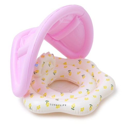 This baby swim float features a built-in headrest and soft leg supports, offering a secure and comfortable fit for growing toddlers. A removable canopy provides added shade and UV protection, giving your child a break from direct sun while still having fun in the water.