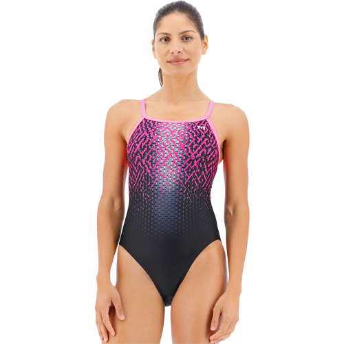 Stay a step ahead of the competition in the TYR Women's Odyssey Diamondfit Swimsuit. Constructed with TYR's most durable textile, Durafast Elite - the Women's Odyssey Diamondfit performance swimsuit utilizes high denier poly fiber and innovative circular knit construction to combine the strength and colorfastness of polyester with the comfort of spandex. Featuring a medium neckline, sleek/flexible straps, keyhole back, moderate cut leg and graphic print, the Diamondfit is ideal for athletes who want reliable coverage during every swim. TYR performance swimsuits are fully lined, provide UPF 50+ sun protection, 360-degree range of motion and an antimicrobial lining for freshness. All Durafast Elite suits are chlorine proof and sustain an impressive 300+ hours of performance. Fabric is a blend of 94% polyester and 6% spandex. Suit is available in multiple sizes and colors.