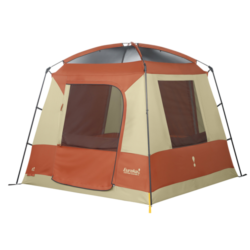 The Eureka Copper Canyon 4 Family Tent is a cabin-styled tent. The tent has vertical walls that are ideal for cot use and maximizes the space and liveability inside. The zippered E! Power Port is a unique feature present in the tent that allows you to bring an electrical power cord inside the tent. Matching yellow webbing on tent and fly couple with the ring and pin assembly to make set up fast and easy. High-stash pockets keep essential things nearby and safe. Gear loft is present overhead in the interior of the tent and used for storage. The tent's free standing and shock corded fiberglass and steel frame is easy to set up. Clips secure the tent body to the frame. Storm guy out pockets stow guy lines on fly during set up and take down. Bathtub floor wraps up sides of tent, protecting against splashing and standing water. For a family of four a perfect tent is Eureka Copper Canyon 4 Family Tent.